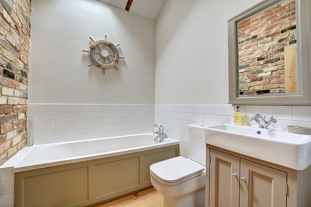 The elegant bathroom features a bath, hand-held shower, and WC.
