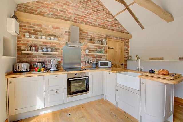 The Old Cart Lodge boasts a fully equipped kitchen with modern appliances, including an electric oven, induction hob, microwave, fridge, freezer, and dishwasher. The spacious lounge area is ideal for relaxing, with a corner sofa and TV/DVD.