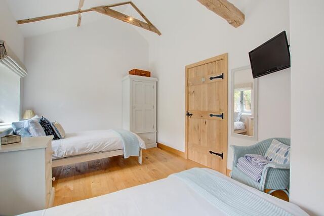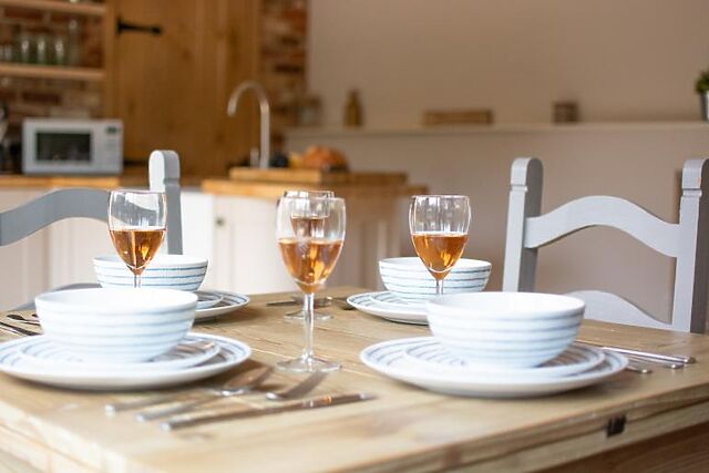 The Old Cart Lodge boasts a fully equipped kitchen with modern appliances, including an electric oven, induction hob, microwave, fridge, freezer, and dishwasher. The spacious lounge area is ideal for relaxing, with a corner sofa and TV/DVD. The underfloor heating ensures a cosy atmosphere throughout the year.
