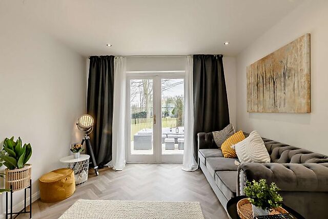 Step outside to a large patio with garden furniture and a hot tub, perfect for evening relaxation. The expansive lawn provides additional space for outdoor activities, making it a versatile area for all ages.