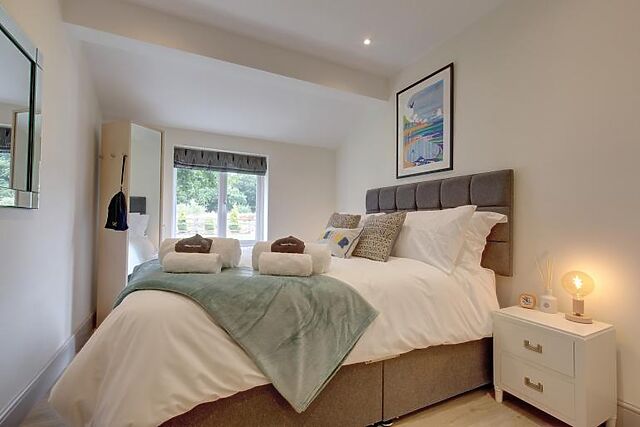 The master bedroom boasts a super king-size bed and an en-suite bathroom, with access to a tranquil patio.