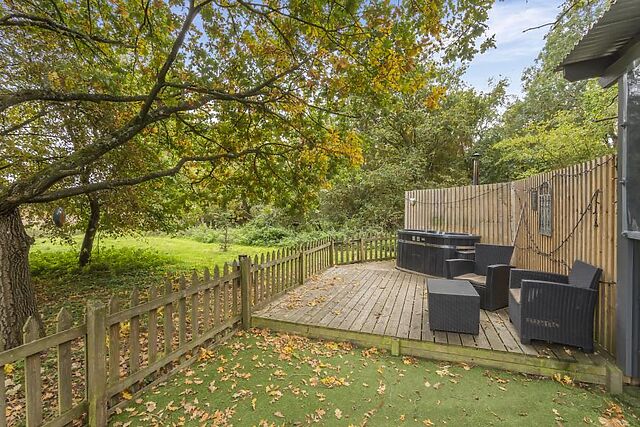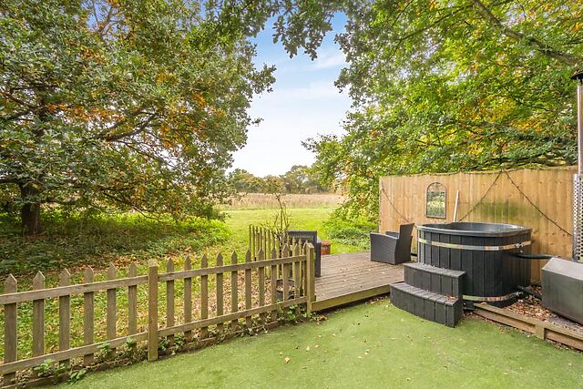 The decked veranda, with roll-down screens and a heat lamp, features a luxurious double-ended outdoor bath with hot water. The wood-fired hot tub, complete with lights and jets, offers a soothing soak under the stars.
