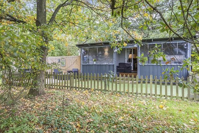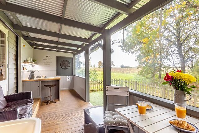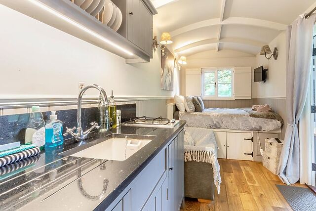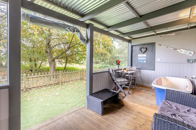 The compact indoor kitchen includes a gas hob and microwave, and the bathroom features a heated shower, flushing toilet, and heated towel rail. Outside, the private garden is fully enclosed with a picket fence, making it perfect for dogs.