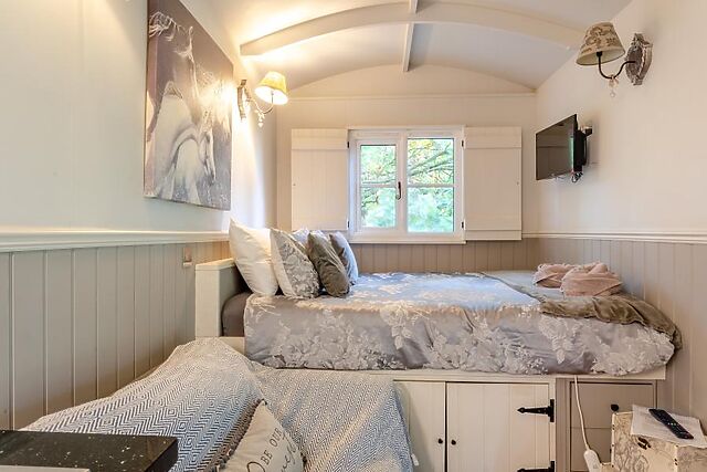 A welcoming and private shepherd’s hut, perfect for couples and their pup pal companions, offering a peaceful retreat with views of the surrounding fields. Located in a picturesque and private rural setting, this dog-friendly accommodation is set within 32 acres of countryside, a mile off-road down a quiet dirt track.