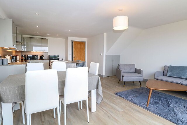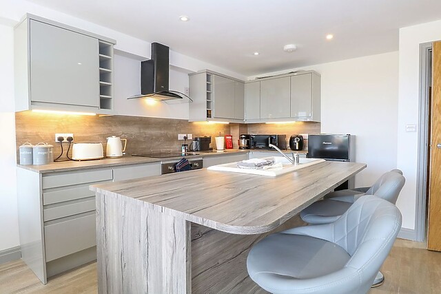 Here, a contemporary kitchen with a lovely breakfast bar invites lively conversations, ensuring the chef never cooks alone. The adjoining dining area, with its elegant table, sets the stage for memorable toasts to a magical holiday, while the inviting sitting area, complete with a Smart TV, beckons you to relax and enjoy cherished moments with loved ones.