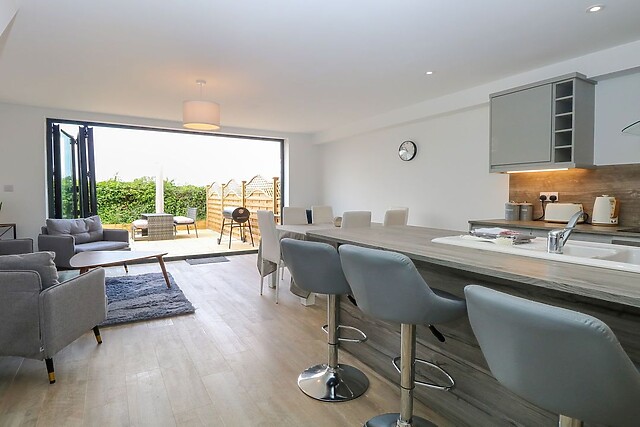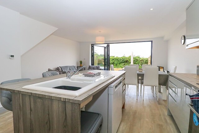 There is also a bathroom with a bath and shower over, as well as a convenient first-floor cloakroom with basin and WC. The true soul of the home lies in the expansive open-plan living area on the ground floor.