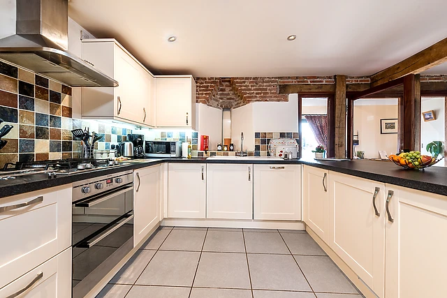 the sitting area offers two three-seater sofas, TV and french doors opening out onto the garden. The kitchen is well equipped with everything you need to cook up a storm, including a double oven with four ring gas hob, fridge, freezer, dishwasher, microwave, washing machine (with line drying facilities), filtered coffee machine, kettle and toaster.