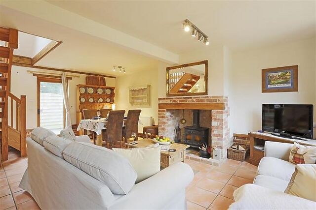Step inside to find a bright and airy lounge/diner with cosy seating, a warming wood burner, and a Smart TV. The adjacent kitchen is fully equipped with modern appliances, including an electric oven, hob, microwave, and dishwasher.