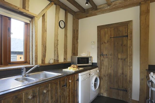 The lounge area is equipped with a wood burner, perfect for winter evenings, and French doors that open onto a paved terrace with garden furniture and a parasol. The kitchen is well-equipped with modern appliances, and there's a dining area for four people.