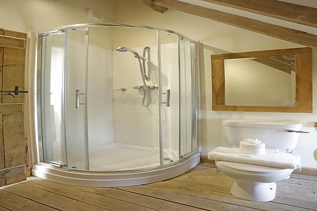 The bathroom includes a corner shower and a separate bath, ensuring comfort for all guests. The large garden is shared with two other holiday cottages and includes mature trees and shrubs.