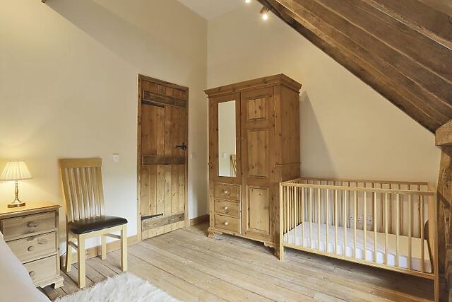 The ground floor boasts 19th-century slate floors reclaimed from The Records Office in Chancery Lane, London. The lounge area is equipped with a wood burner, perfect for winter evenings, and French doors that open onto a paved terrace with garden furniture and a parasol.