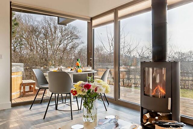 - The lounge features a Smart TV, comfortable seating and a wood burner. - Well-equipped kitchen space and separate dining area.