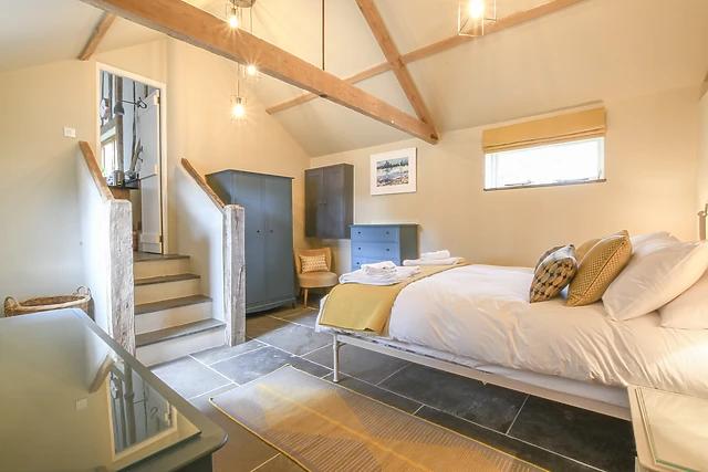 The open-plan living area, with its high ceilings and exposed beams, blends historical elegance with modern comforts.