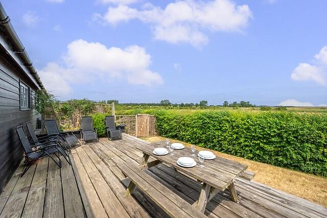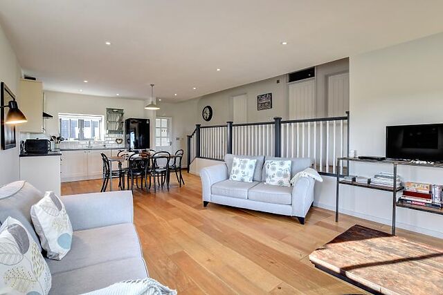The cosy living area features two comfy sofas, a wood burner, and large French doors that open onto a sun deck with stunning views of the surrounding fields and coast. The modern kitchen and dining area are well-equipped, ensuring you have everything you need for a relaxing stay.