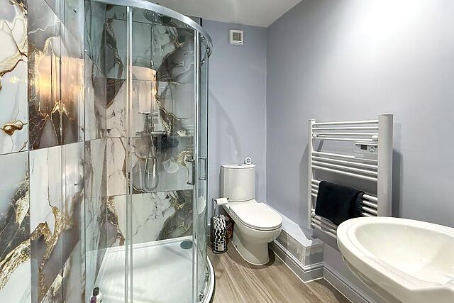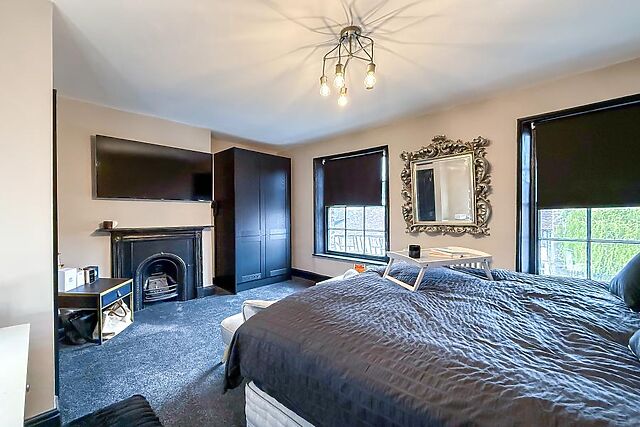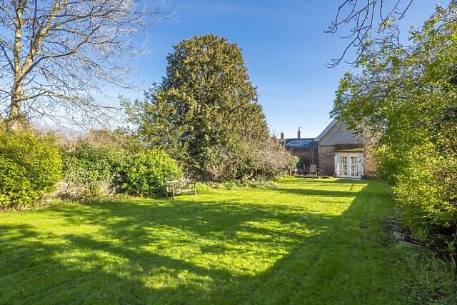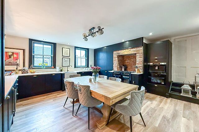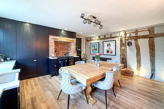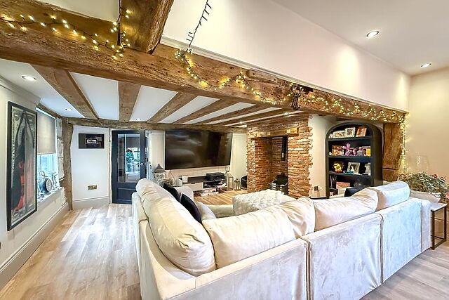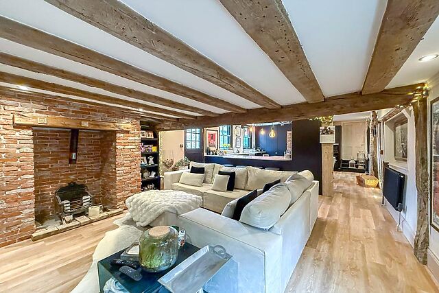A door leads through to the characterful drawing room with further seating, another roaring wood burner and French doors leading out into the garden. The ground floor also features a bathroom.