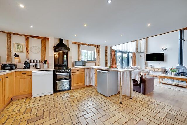 Upon entering, you'll find a spacious open-plan area featuring a country-style kitchen, a cosy lounge with comfortable sofas and a wood burner, and a dining area perfect for communal meals.