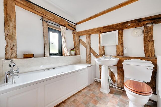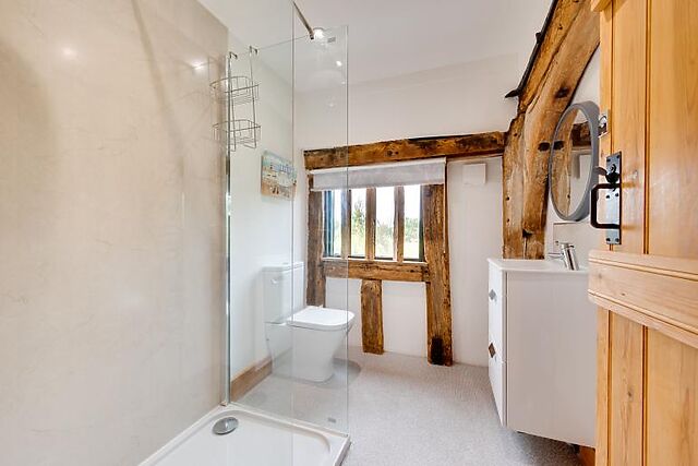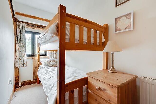The ground floor houses a double bedroom with an en-suite shower room, while the first floor offers two super-king bedrooms and a room with bunk beds for children.