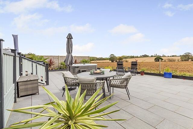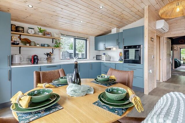 Take a moment to soak up the the glorious view across open fields from two sets of French doors before you head to the bespoke kitchen area to rustle up some dinner. Get everyone together to eat at the stylish dining table, before making a beeline for the sofa to enjoy a glass of wine by the electric flame-effect fire.