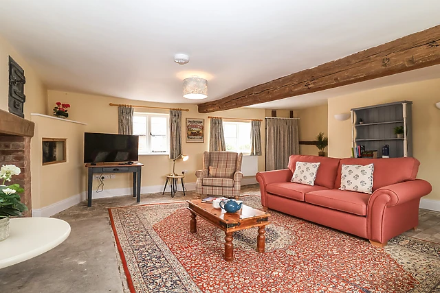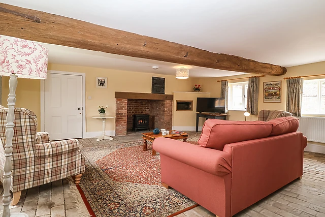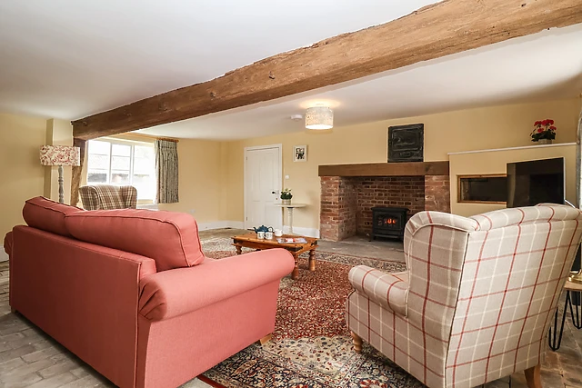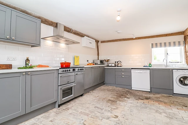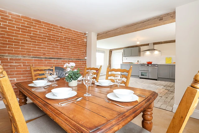 Kitchen/Dining Room With views out across the rolling countryside, this spacious room is very much the heart of the home, and a space for people to enjoy special celebrations. The beautiful kitchen is bespoke with original exposed brick flooring.