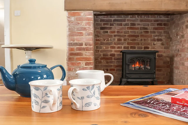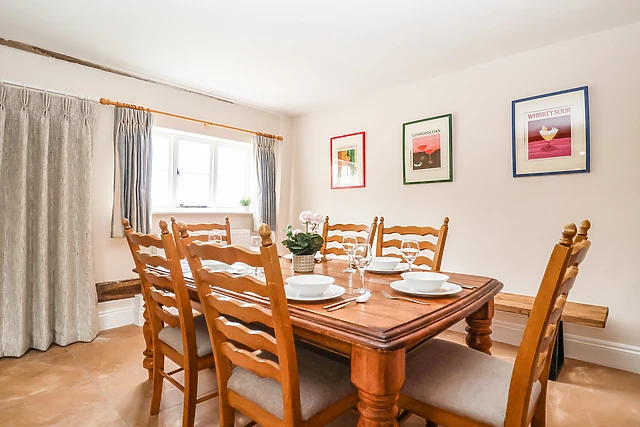 The dining area with inglenook brick fireplace with electric fireplace creates a beautiful space to dine, and a table which comfortably seats 12. This is a wonderful space for family and friends to enjoy quality meals together.