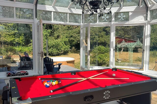 Sunlight pours in from the adjoining conservatory, illuminating the space and drawing your gaze to the lush greenery beyond. The conservatory itself is a haven for play and relaxation, with a black chandelier suspended above a versatile games table—set for table tennis, pool, or air hockey—while panoramic windows frame tranquil garden views.