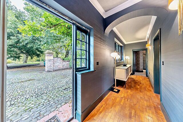 The outdoor space is equally impressive, with a large enclosed garden, mature trees, and manicured flowers.
