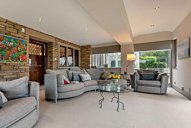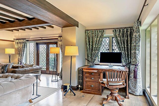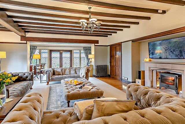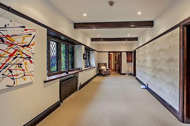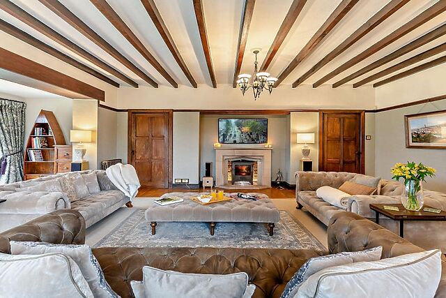 It is blessed with spacious grounds, large, bright rooms with far-reaching views and long hallways that are almost living areas in their own right. The main lounge is a comfortable space with exposed beams and seating arranged around a wood burner.