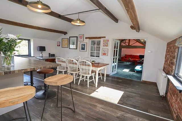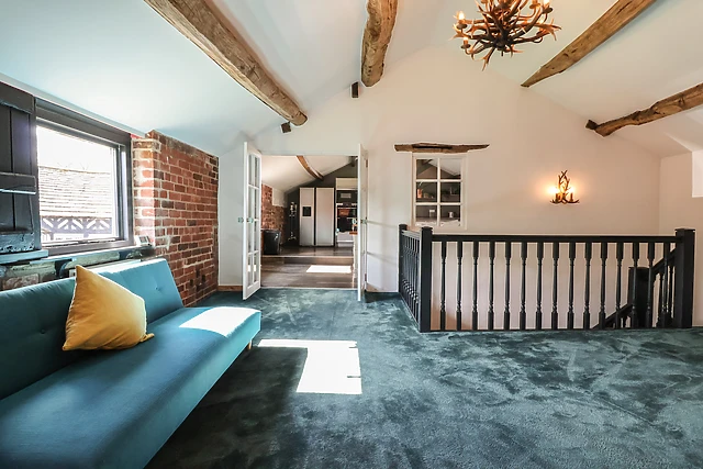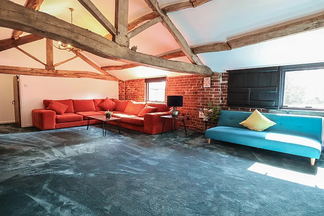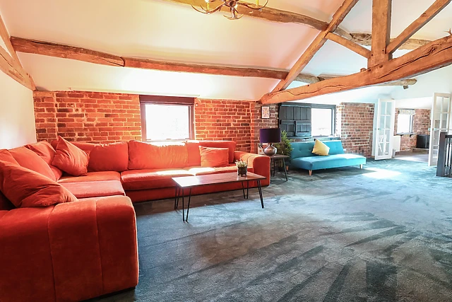 Pass through the electronic gates into your private parking space, ascend the stairs, and enter the property situated on the barn's top floor. The lounge, boasting original beams, a high vaulted ceiling, and exquisite chandeliers, offers a spacious corner sofa, a large Smart TV, and super-fast Wi-Fi, creating an ideal setting for quality time with friends and family.