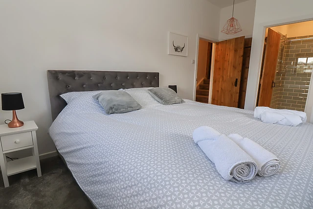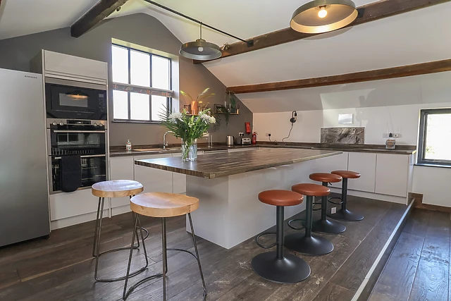 The modern kitchen comes equipped with an American-style fridge-freezer with a cold water dispenser, an integrated double oven with a microwave above, separate induction hob on the countertop, and dishwasher. The barn houses three king-sized bedrooms, one with a large, beautifully tiled en-suite shower room.