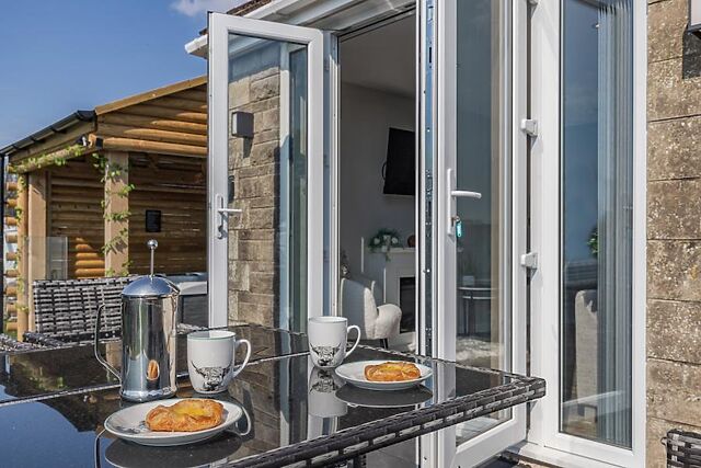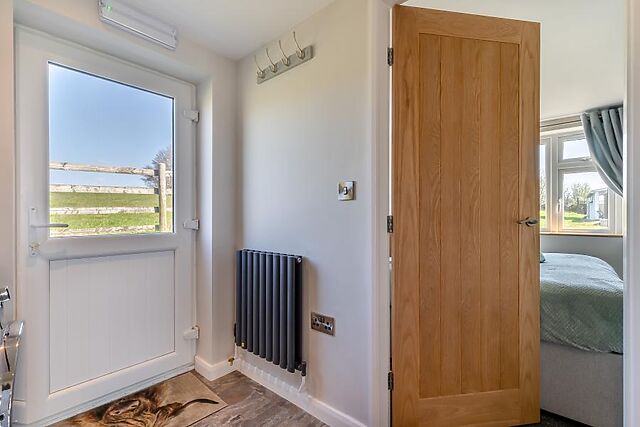 The cosy living space invites you to unwind with its plush seating, Smart TV, and warming electric fire, while the well-equipped kitchen and dining areas offer stunning views over rolling fields. On the ground floor, you’ll find a double bedroom with built-in cupboard storage, a dressing table, and bedside lighting for a restful night’s sleep.