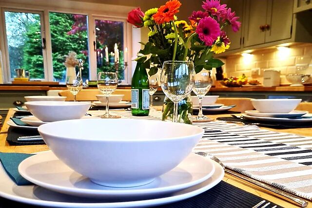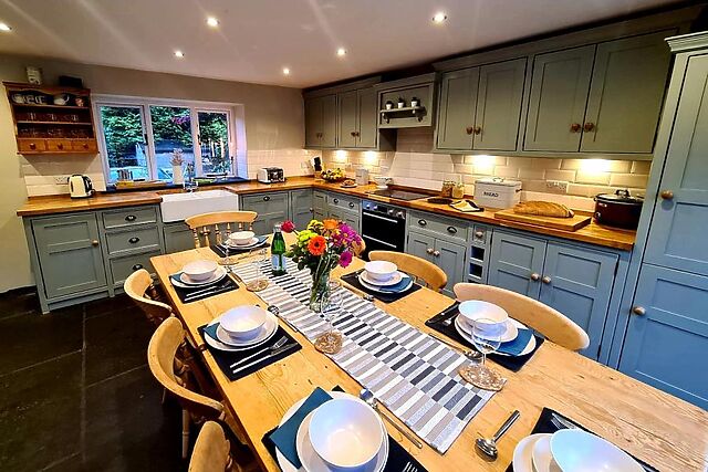 This also has doors that can be pulled back to the garden in the spring and summer months. Find ample food storage in the units and plenty of preparation space on the wooden work surfaces so you can cater for yourselves and dine together in comfort.