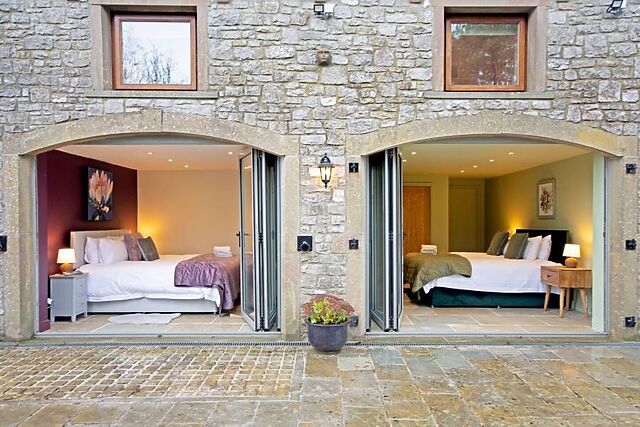 The layout has been thoughtfully designed for families and small groups, offering comfort, flexibility, and a natural flow throughout. On the ground floor, two generous bedrooms open directly onto the outside through patio doors, allowing light to flood in and creating an easy connection with the surrounding countryside.