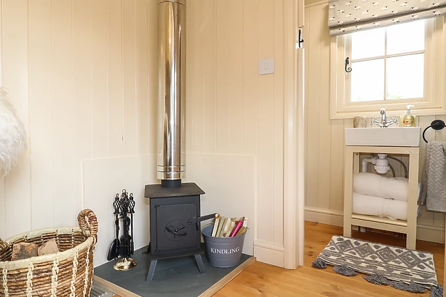 The hut is equipped with electric heating and a woodburning stove, providing a cosy and warm atmosphere throughout the accommodation.