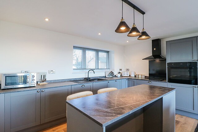 The well-appointed kitchen is fully equipped for rustling up home-cooked meals, best enjoyed around the dining island, where you can gather to share stories and plan the day's adventures. A dedicated utility area, complete with a washing machine, ensures convenience throughout your stay.