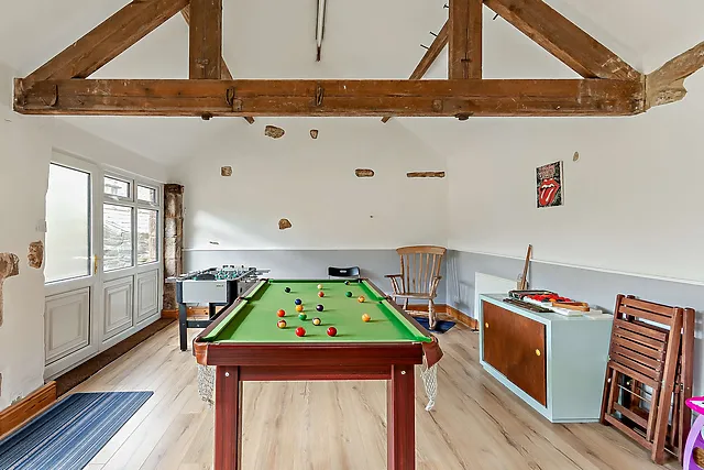 Yes, the property includes a games room equipped with a pool table, table football, dart board, and a selection of board games, offering entertainment for all ages.