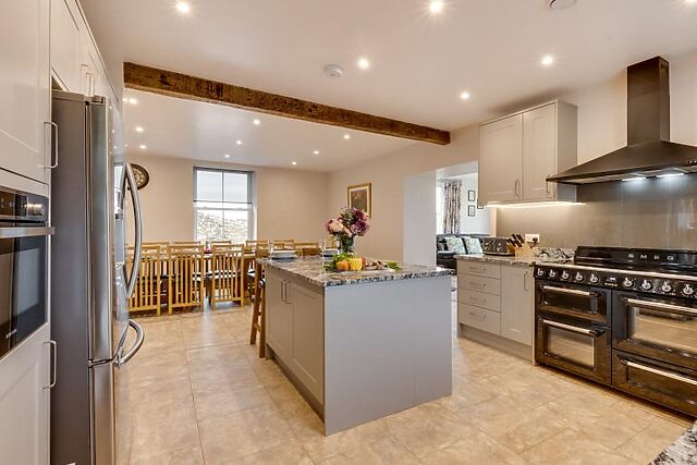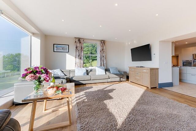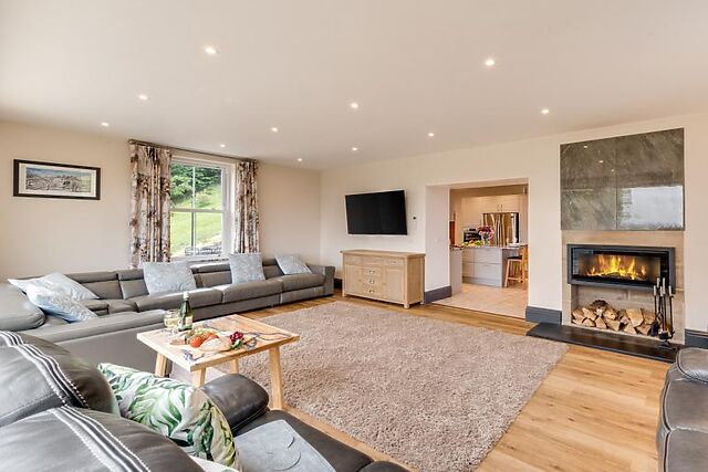 Inside, find a kitchen/diner with a 14-seater table, a central island, and granite worktops, ideal for communal dining. The lounge's floor-to-ceiling glass windows offer breathtaking views, complemented by a cosy wood burner.