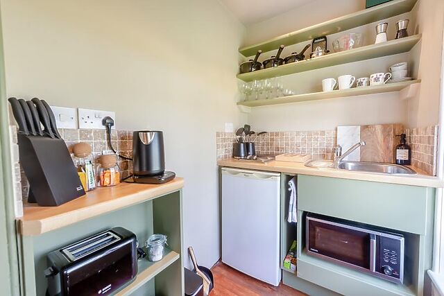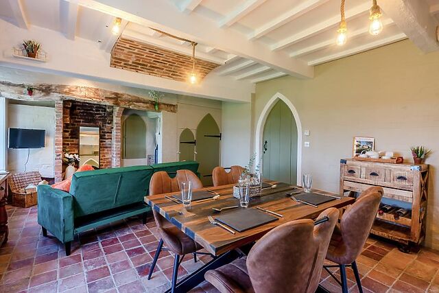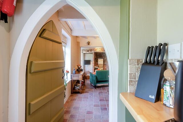 Arrive through the elegant Ogive arch-shaped door, a design style that continues throughout the home, leading into the open-plan lounge. Here, you'll find an inviting space with a coal-effect electric fire, plush sofa bed, and modern conveniences, including a Smart TV and Alexa to play your favourite tunes.