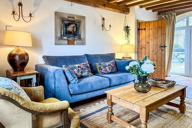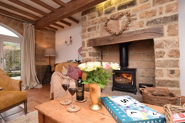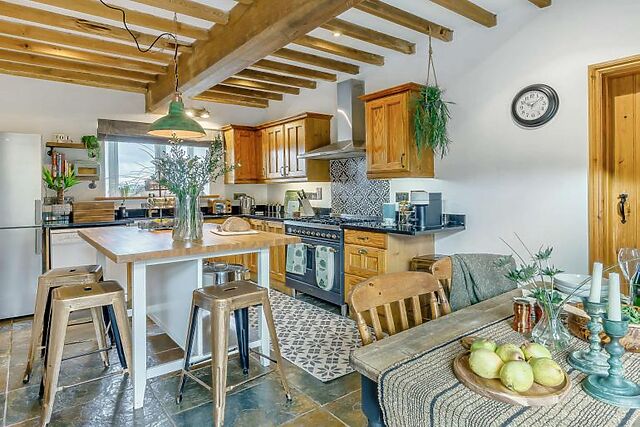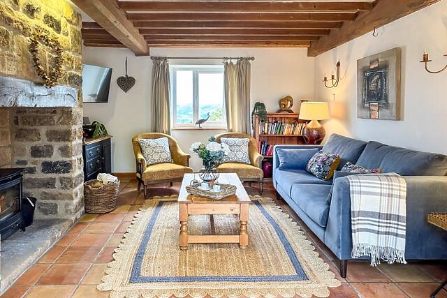 Inside, the cottage boasts a range of modern amenities, including a range cooker, a wood burner for cosy evenings, and Smart TVs for entertainment. The master bedroom's vaulted ceiling and exposed beams add to the property's character, while the stunning views over the valley captivate the senses.