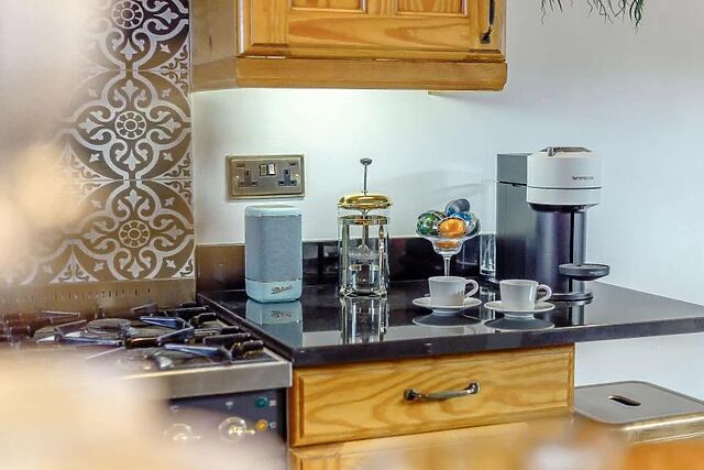 The accommodation is equipped with a range cooker with a gas hob, fridge/freezer, dishwasher, microwave, and a Nespresso coffee machine, making it ideal for self-catering stays.