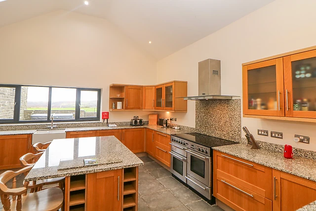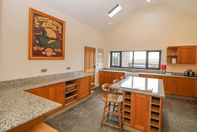 From here is the delightful kitchen with a breakfast bar, granite work surfaces and a Belfast sink and which has everything you need to cook lovely home-made meals. These meals can then be enjoyed around the dining table from where wonderful countryside views can be admired.