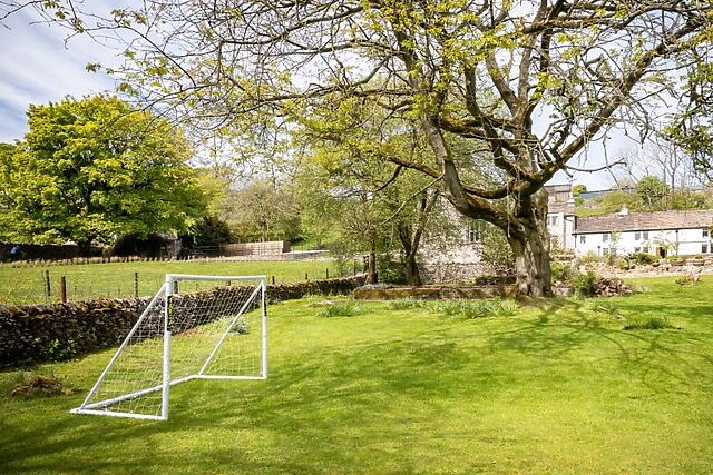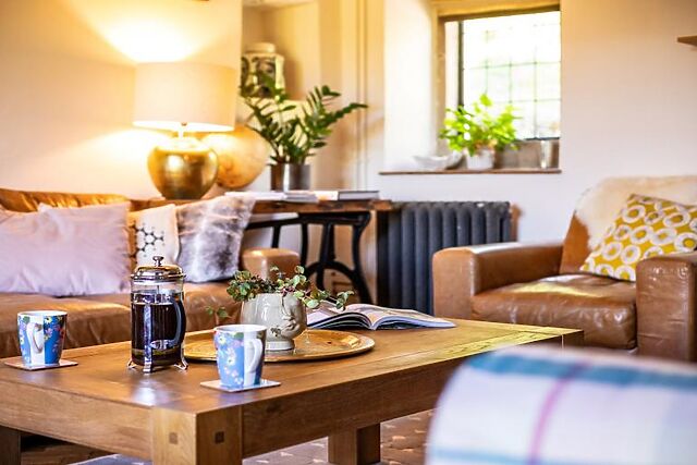 The farmhouse-style kitchen to the right is a wonderful space to rustle up a meal for the family. Guests can really get stuck into country life by cooking on the traditional Aga.