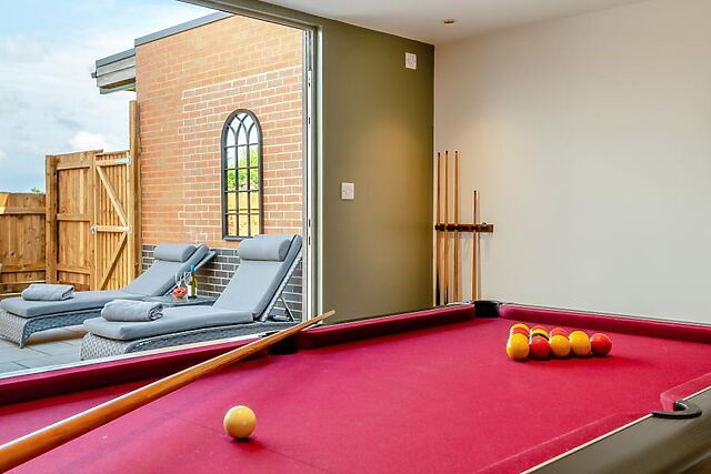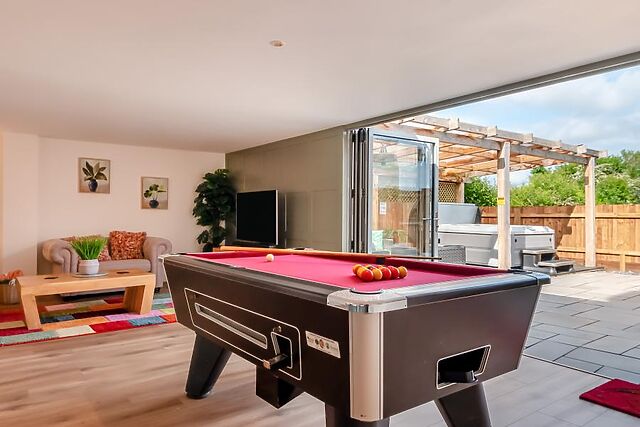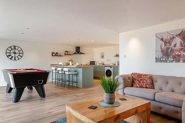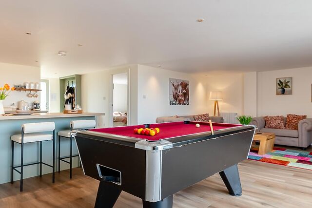 For your entertainment, there is a full-sized pool table in the centre of the space. In the evening, retire to the double bedroom with striking feature panelling and a shower room with a double walk-in shower and WC.