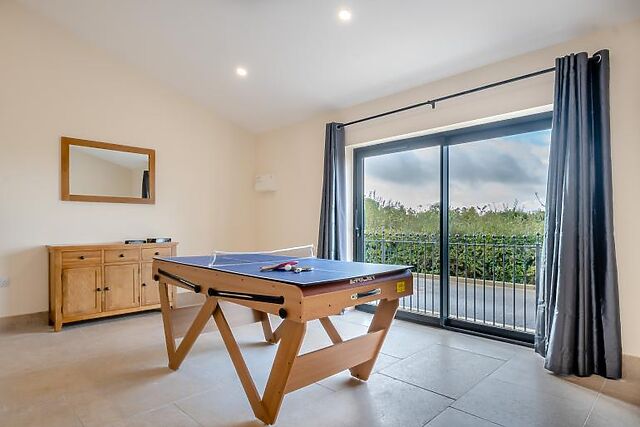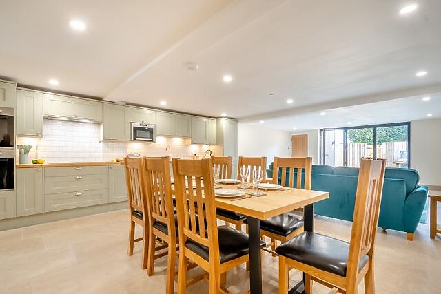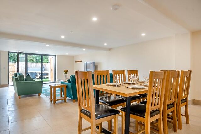 The open-plan ground floor features a cosy lounge with comfortable sofas and a Smart TV, a fully equipped kitchen, and a dining table that seats eight. There’s also a second living area with a pool table for added entertainment.