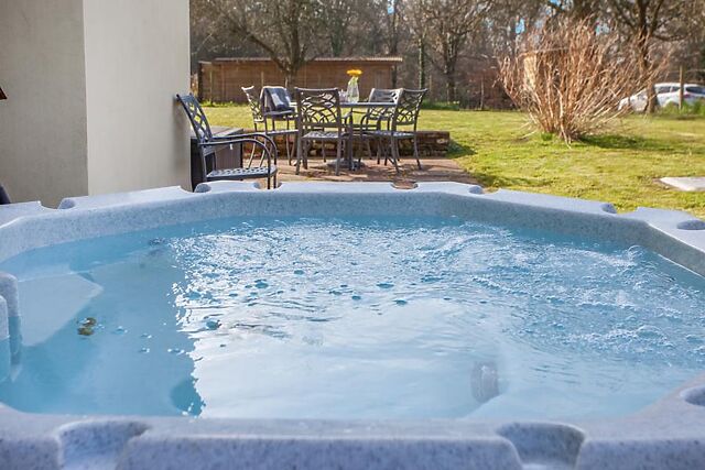 Outside, the spacious enclosed gardens overlooking the small campsite with shepherd’s huts provide ample space to relax, play, or simply take in the natural surroundings. There’s even a private hot tub where you can sink in and soak under the stars.