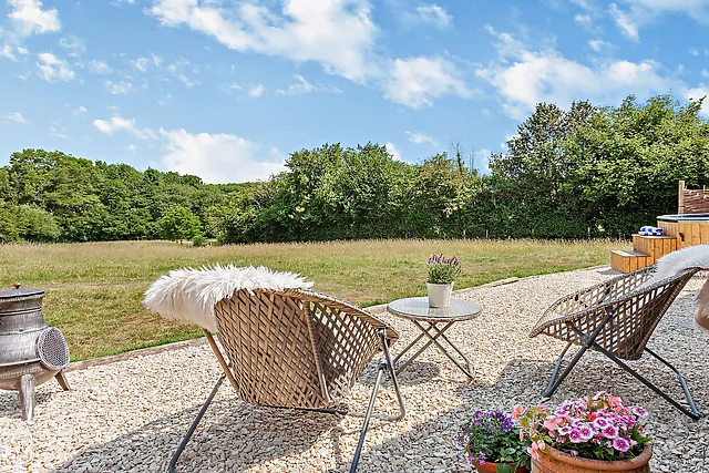 The cottage features an enclosed meadow and a seating area with a table and chairs. There is also a BBQ available for summer dining, allowing you to enjoy meals amidst the beautiful countryside.