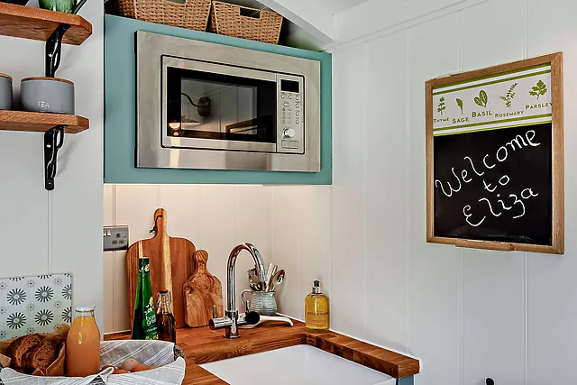The accommodation sleeps two and offers a luxurious king-size bed, ensuring a restful night's sleep. The open-plan living area, complete with a wood-burning stove, provides a cosy space to unwind. The bespoke kitchen is well-equipped for meal preparation, adding to the comfort of your stay.