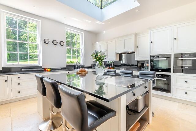 Guests can choose between two lounges, both offering exceptionally comfortable seating, a wood burner, and windows framing views of the grounds. The capacious kitchen is centred around an impressive island—a handy place to perch for coffee or casual meals - while the adjacent formal dining room is perfect for sit-down dinners.