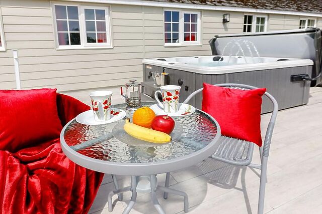 The highlight is the generous six-person hot tub, reserved exclusively for your indulgence, ensuring privacy and relaxation amidst the breathtaking countryside.