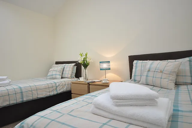 The accommodation has two bedrooms, one with a double bed and another with twin beds that can be linked to form a king-size bed, catering to different group or family needs.