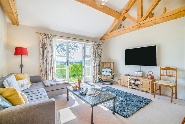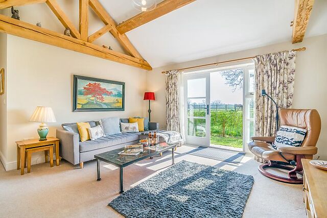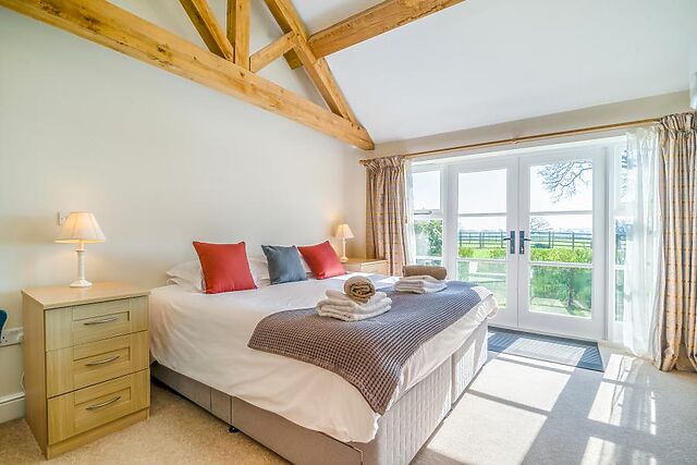 Both bedrooms feature beamed and vaulted ceilings and French doors leading outside. The super-king-size bedroom and double bedroom offer a truly tranquil retreat with great views.